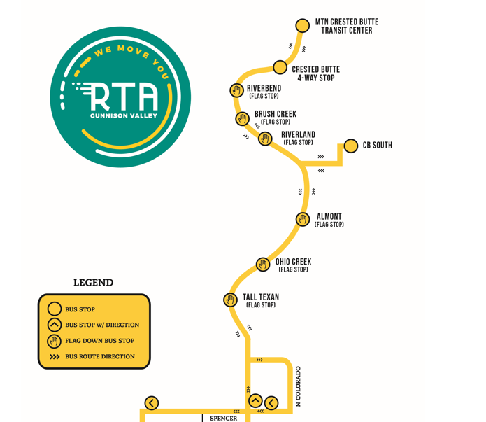 The RTA Free Bus runs a loop through the City of Gunnison before heading north on Hwy 135 to Crested Butte and Mt. Crested Butte. The bus leaves the following stops no earlier than the times listed. There may be delays due to weather.